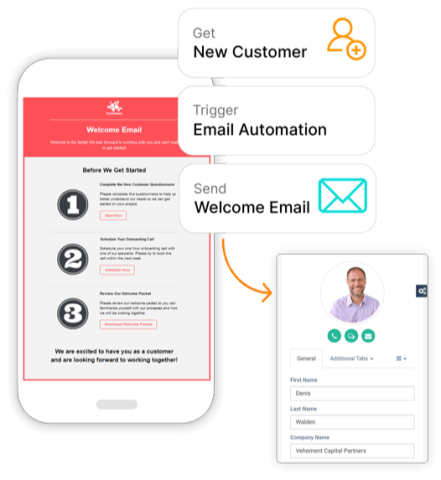 You can have automation workflows automatically triggered once a person becomes a new customer. This can be from a pipeline status change, a quote is approved, or any number of other customer actions.